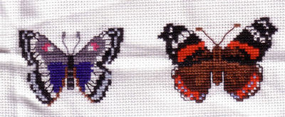 première broderie en 1998 : deux papillons d'une fiche "Anchor"