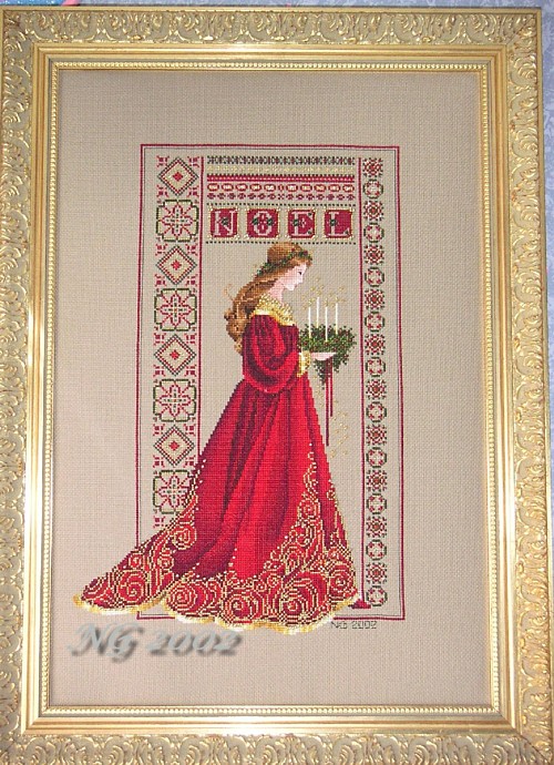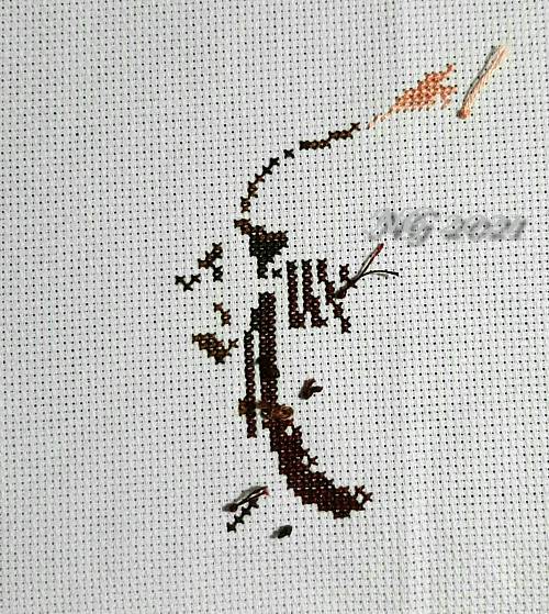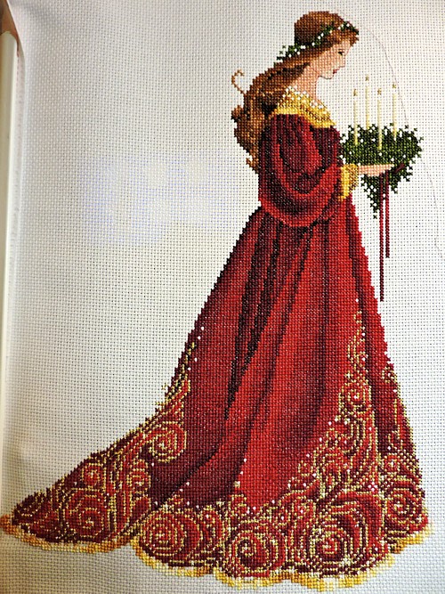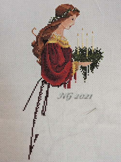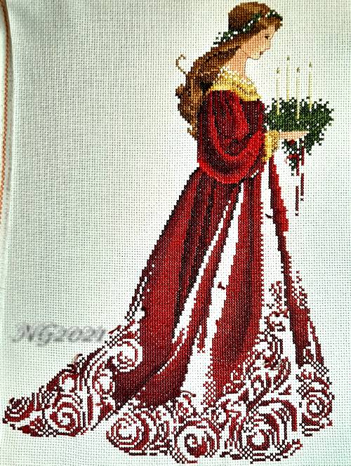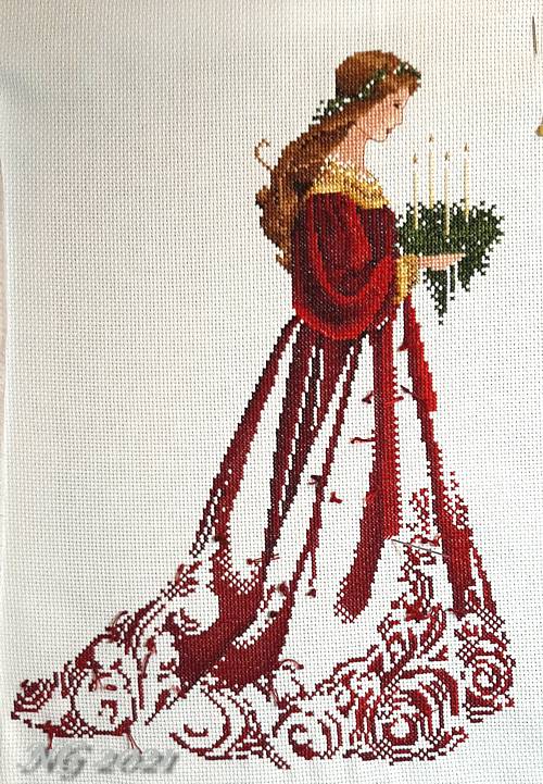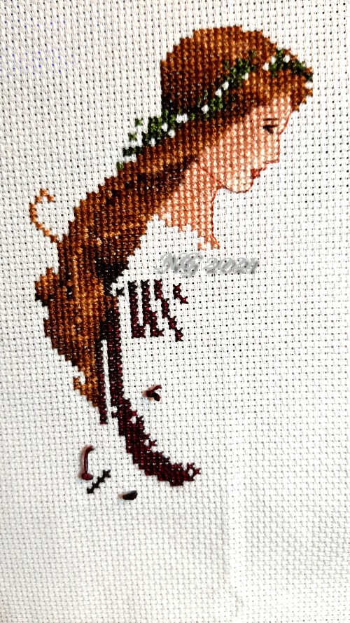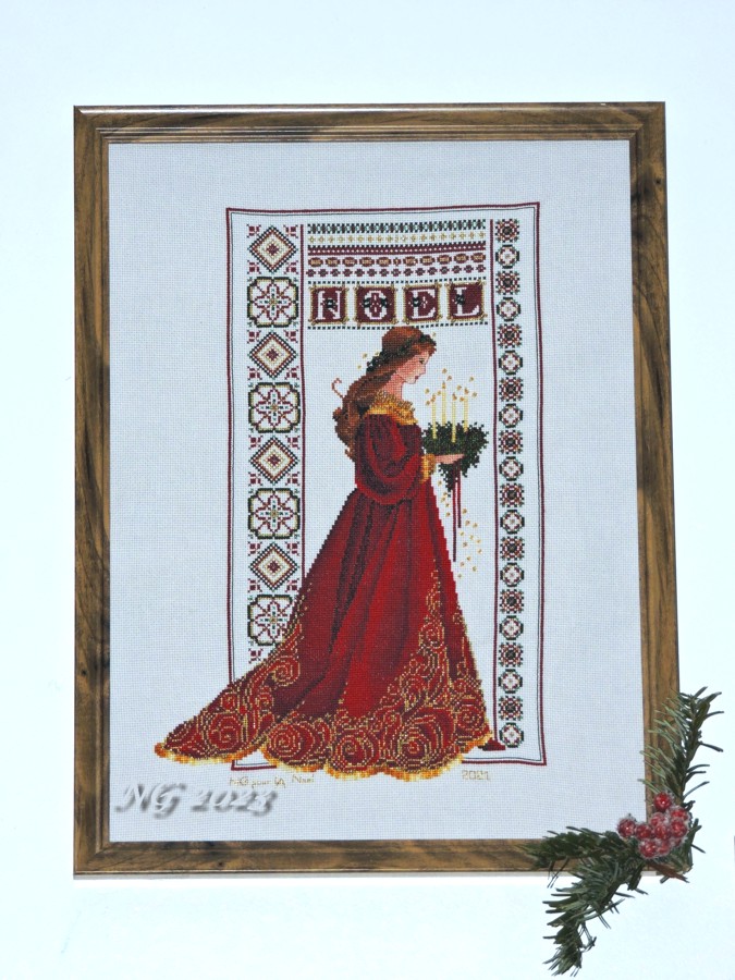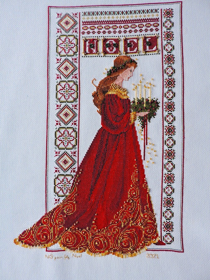 J'aime toujours autant cette série que j'ai commencée en 2002. Il y a quelques temps, environ un an, je regardais ma Celtic Chrismas et je trouvais que quelque chose clôchait sans arriver à mettre le doigt ou plutôt l'oeil sur le problème en question et d'un coup, j'ai compris : le rouge 498 finit par "virer" au marron/vieux rose : le dégradé s'en trouve gâché à mon goût. Il va falloir que je me la refasse sur la même toile marron qu'à l'origine car désencadrer, débroder et rebroder... non, le courage va me manquer . Alors que j'en parlais avec une de mes petites cousines, en rigolant, à sa question "mais que feras-tu de celle-là ?", j'ai répondu en rigolant que "je la "virerai". Elle m'a alors dit que non si je la jetais, elle était volontaire pour l'adopter... mais hors de question de lui donner un truc déjà abimé. Comme elle brode aussi, on a discuté et au mileu de tout ce qu'on évoquait, j'ai réussi à savoir sur quelle toile, elle la verrait bien et je me suis mise à la broder pour elle , donc en premier, sur une aïda zweigart 7 pt/cm "silvery moon" en gros la couleur 762 DMC, au moment de ma première vaccination contre le covid. Objectif ? bien sûr finie pour Noel de cette année !