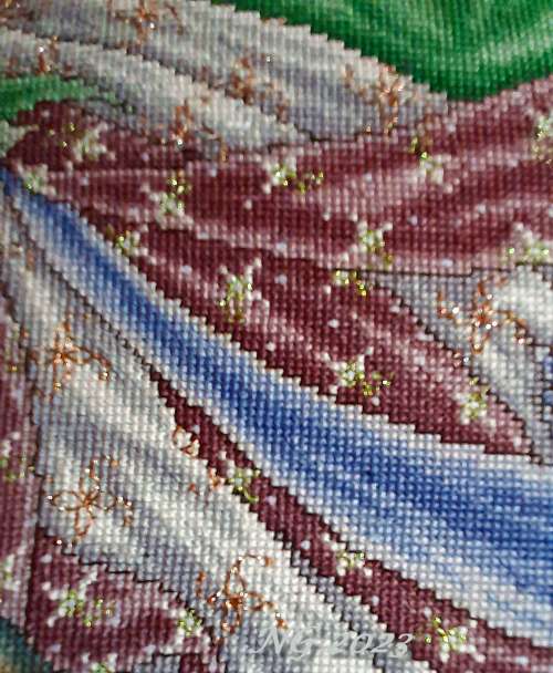 Le 27 août 2023 : les fils verts métallisés dans la partie prune sont également brodés mais avec un fil différent de celui prévu car il n'est pas disponible. Il s'agit du Petite treasure braid de Rainbow gallery # 56 , en réalité très peu visible sur la photo d'ensemble (voir la photo des détails.