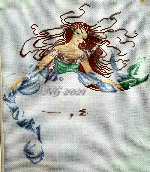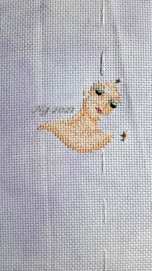 Les couleurs sont volontairement saturées et la photo légèrement floue pour accentuer la brillance des fils (or et vert qui sont très doux). Je commence les ailes .